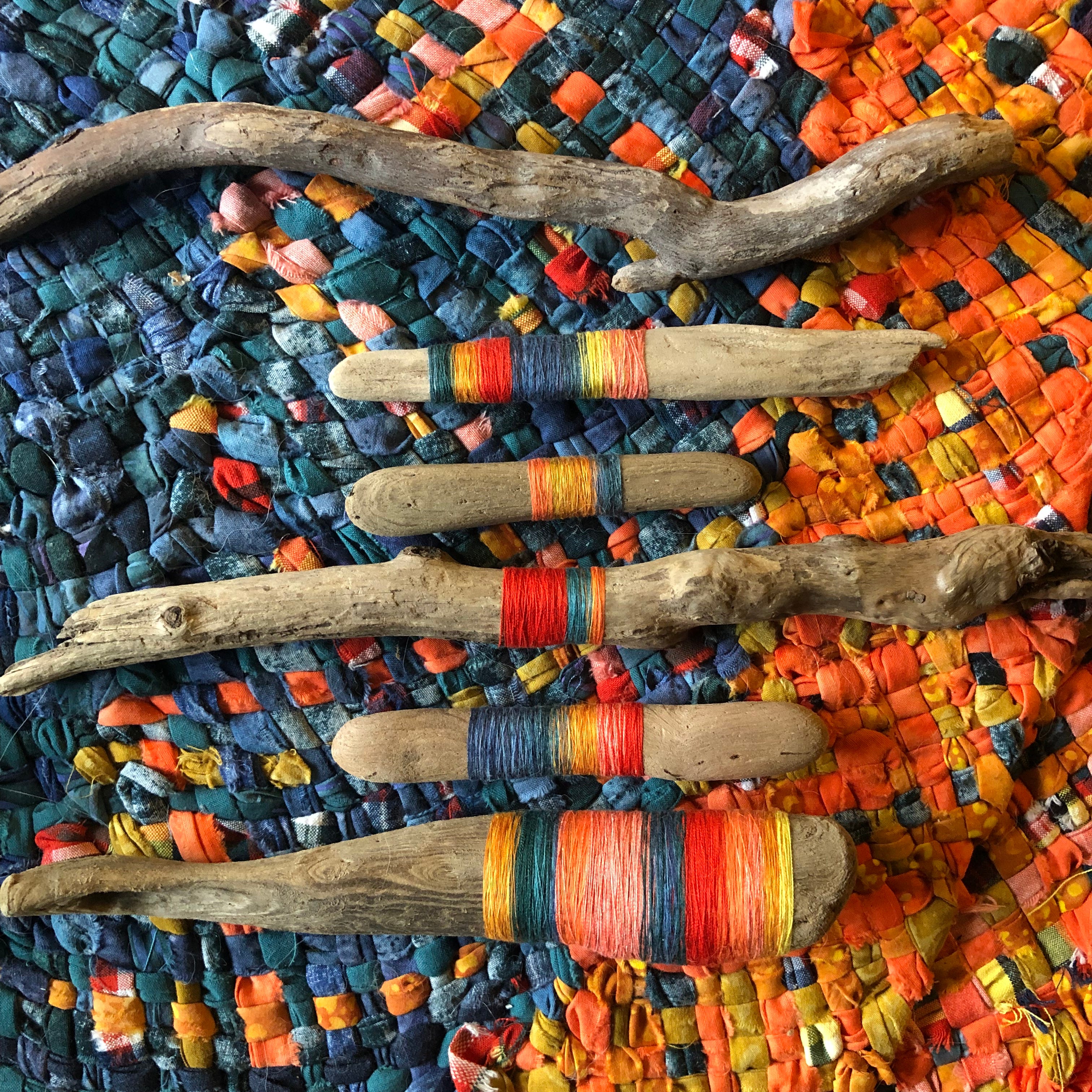 rug: Inspired by the work of Kaci Smith, I started saving the threads from my fabric strips and wrapping them around some of the driftwood scraps I had saved from visits along the Oregon coast. I’ve added stick collecting to my hiking routine, too—picking up one from our adventure to add to the collection.