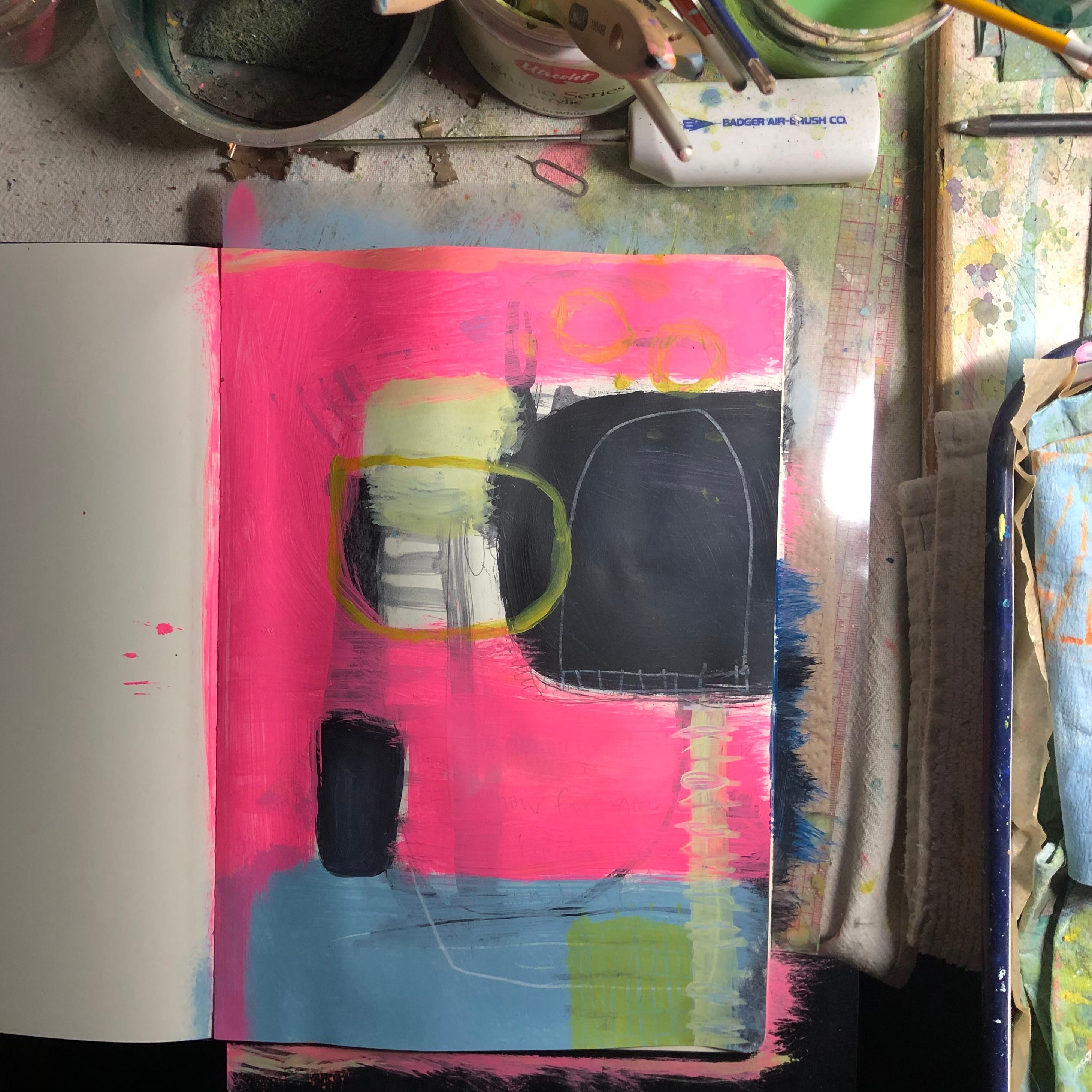 paints: I’ve had an idea in mind to experiment with—keeping a painting sketchbook to work on at my painting workspace. I’m still in the early stages of figuring out how it all works within my process, but so far it has a space and I have finished the first page. My thought is that it can be a place to keep pushing ideas with less of a ‘risk’ since it’s on paper.