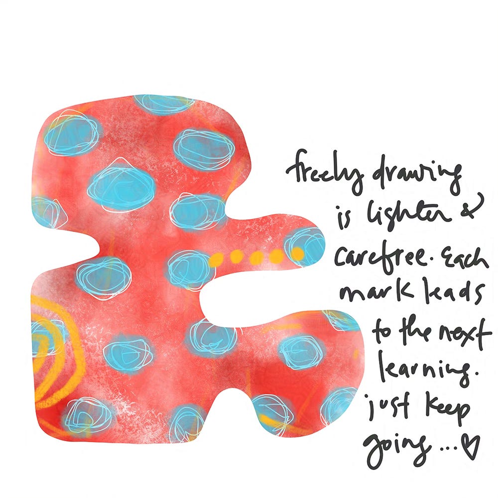 Quickly sketching with lines and shapes can help loosen up our body and mind to the creative process. Finding ways to let your mind pause the judgements so you can play is key. Have fun first, you’ll learn how to edit later. It won’t take much of a nudge to get your brain pointing out the places for improvement, ha!